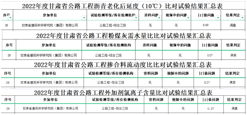 2022年12月12日,甘肅省交通建設質量安全造價中心公布了《關于甘肅省2022年公路工程試驗檢測機構及工地試驗室比對試驗結果的通報》,甘肅建科院市政公路專業事業部參加的各項比對試驗均獲得“滿意”結果。