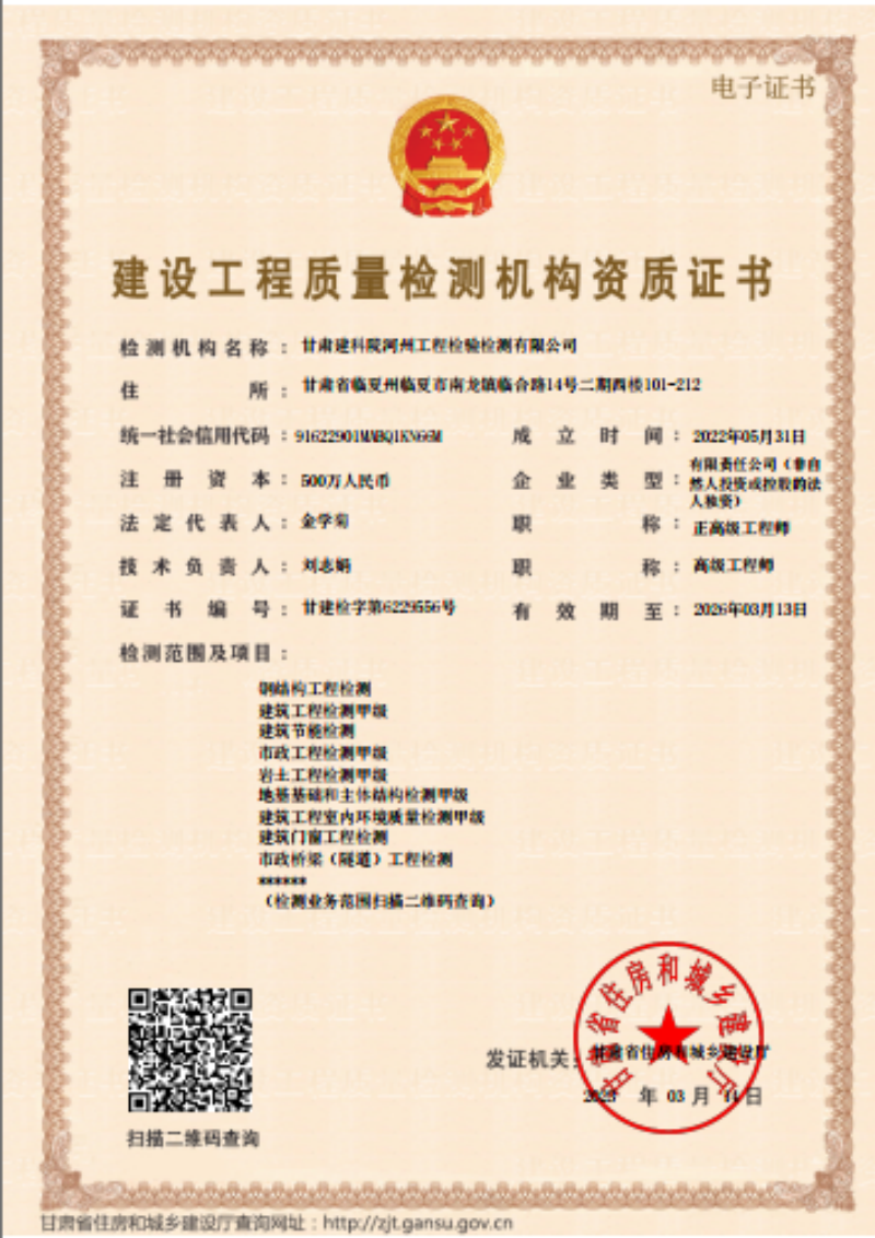 近日,甘肅建科院河州工程檢驗檢測有限公司成功取得甘肅省住房和城鄉(xiāng)建設廳頒發(fā)的建設工程質(zhì)量檢測機構(gòu)資質(zhì)證書。