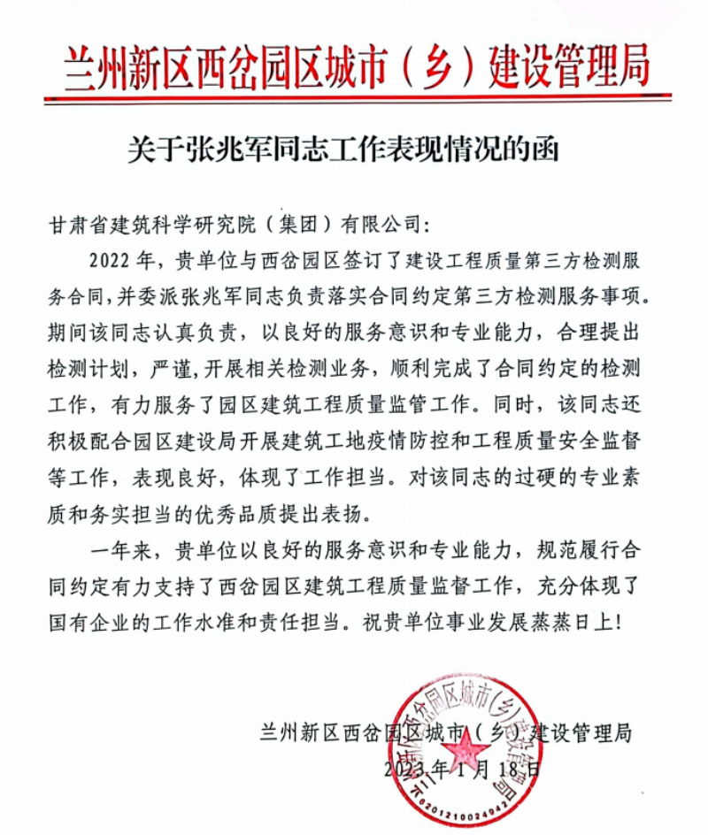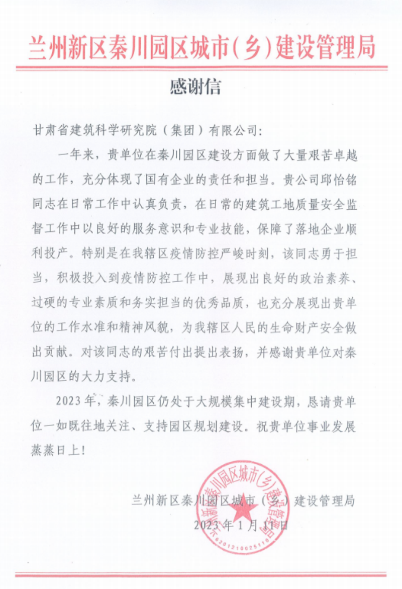 日前,建科院新區(qū)檢測中心收到了來自蘭州新區(qū)秦川園區(qū)城市(鄉(xiāng))建設管理局、西岔園區(qū)城市(鄉(xiāng))建設管理局的兩封感謝函,在對建科院的工作水準和服務質量做出充分肯定的同時,感謝建科院對秦川園區(qū)和西岔園區(qū)建設的貢獻與支持,對建科院職工為當?shù)刈龀龊玫呢暙I表示衷心感謝。