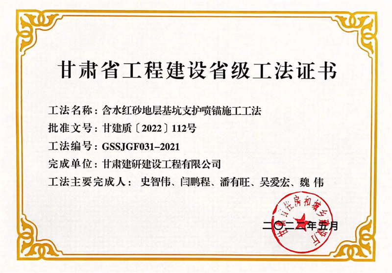 近日,省住房和城鄉(xiāng)建設(shè)廳發(fā)布甘肅省2021年度工法公告,建科院建研建設(shè)公司申報(bào)的含水紅砂巖地層基坑支護(hù)噴錨施工工法評(píng)定為省級(jí)工法。